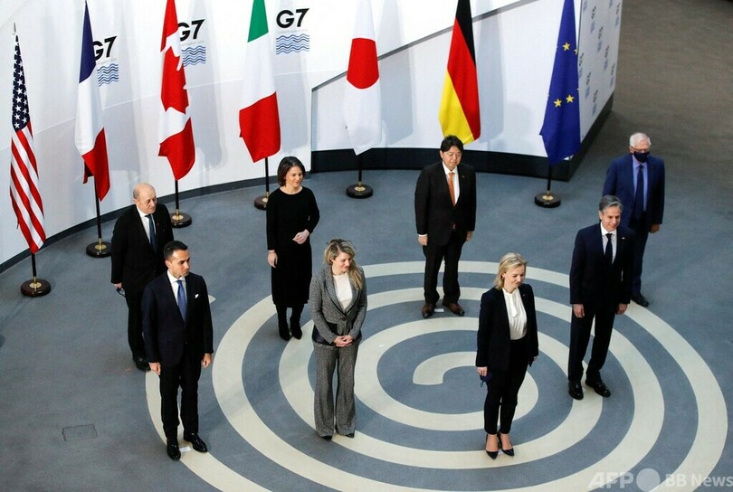 G7外相会合は2日間の日程で開かれる。初日の11日は、ロシアによるウクライナ侵攻危機と、強硬姿勢を強める中国への対応が、議題の中心を占めた。冒頭でリズ・トラス(Liz Truss)英外相は、「自由と民主主義の範囲を狭めようとしている侵略者に立ち向かうため、われわれは強く団結しなければならない」と訴えた。