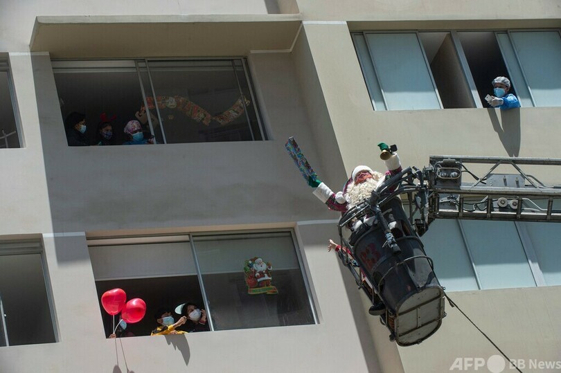 【12月15日 AFP】ペルーの首都リマで14日、サンタクロースがはしご車から、新型コロナウイルス感染症(COVID-19)と闘う子どもたちにプレゼントを渡した。
