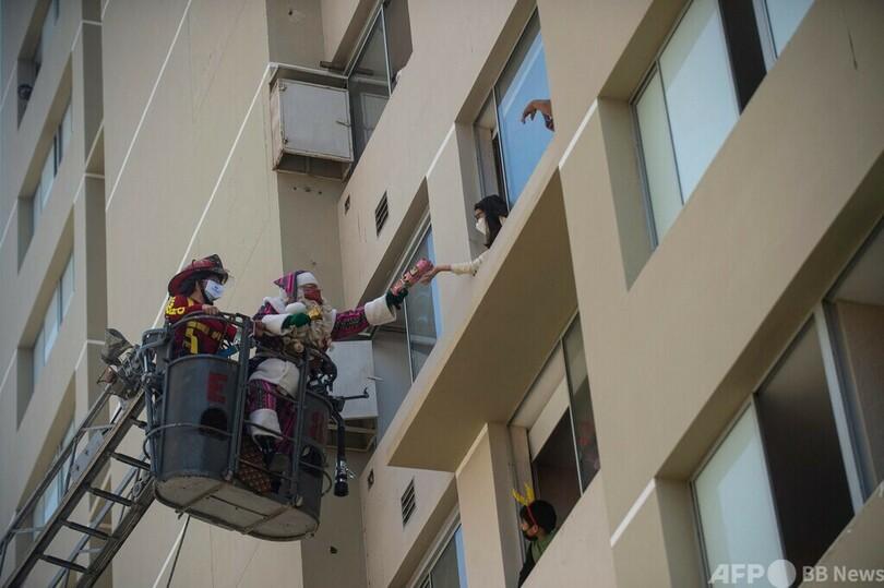 【12月15日 AFP】ペルーの首都リマで14日、サンタクロースがはしご車から、新型コロナウイルス感染症(COVID-19)と闘う子どもたちにプレゼントを渡した。