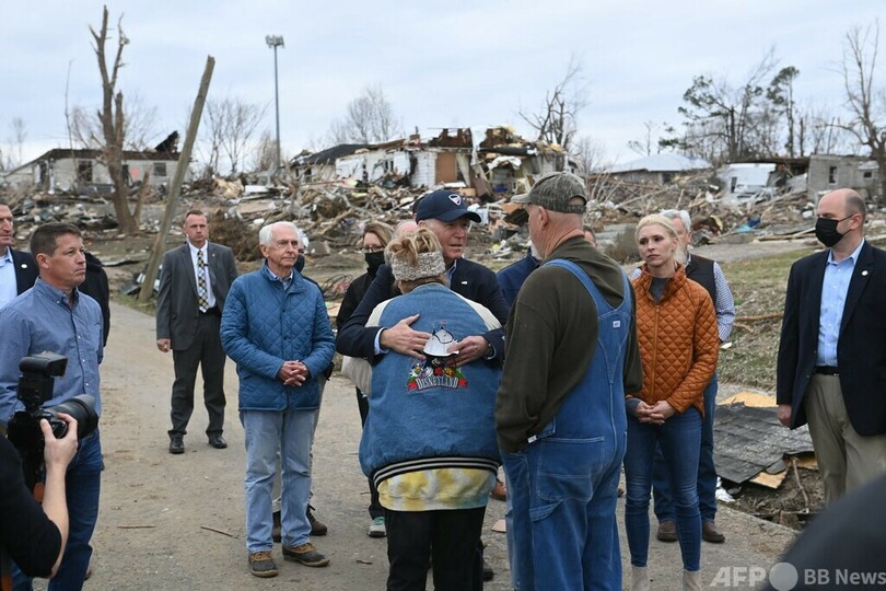 バイデン氏は濃紺のスーツにノーネクタイ、野球帽という服装で、人口約2500人のドーソンスプリングス(Dawson Springs)と人口約1万人のメイフィールド(Mayfield)を訪問。「被害の範囲と規模は想像を絶する」と述べた。