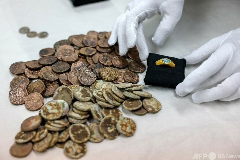 IAAによると指輪の他に、3世紀のローマ硬貨やワシのブロンズ像、仮面をかぶる人の像、鐘、器なども見つかったという。