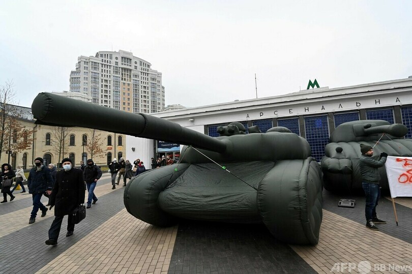 【12月27日 AFP】ウクライナの首都キエフで、空気で膨らませる軍装備品のダミーを製造する民間企業の従業員らが、国防省から代金の支払いを拒否されたことに抗議するため、地下鉄の駅の前に戦車のダミーを置いてデモを行った。(c)AFP