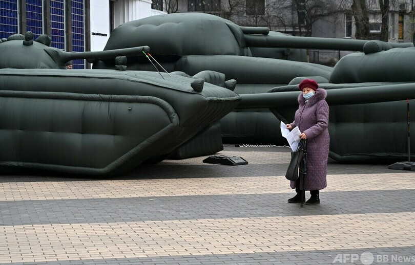 【12月27日 AFP】ウクライナの首都キエフで、空気で膨らませる軍装備品のダミーを製造する民間企業の従業員らが、国防省から代金の支払いを拒否されたことに抗議するため、地下鉄の駅の前に戦車のダミーを置いてデモを行った。(c)AFP