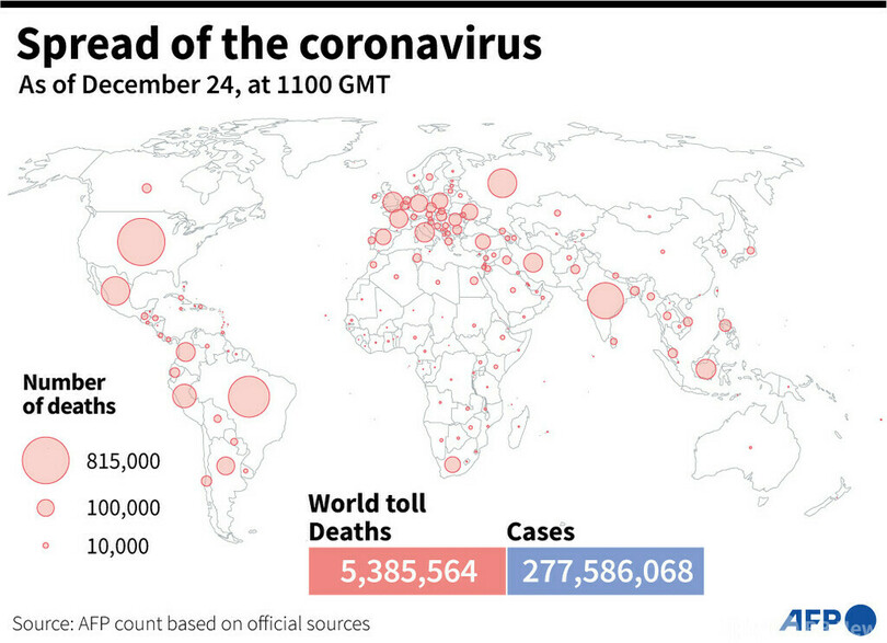 【12月25日 AFP】AFPが各国当局の発表に基づき日本時間24日午後8時にまとめた統計によると、世界の新型コロナウイルスによる死者数は538万5564人に増加した。