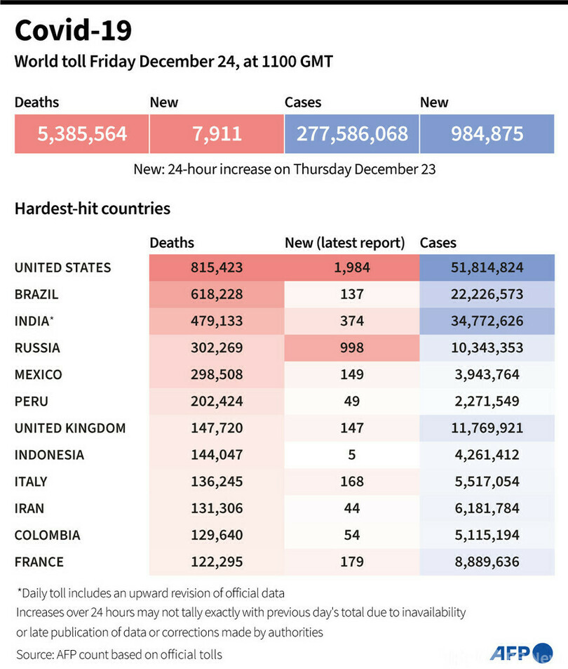 【12月25日 AFP】AFPが各国当局の発表に基づき日本時間24日午後8時にまとめた統計によると、世界の新型コロナウイルスによる死者数は538万5564人に増加した。