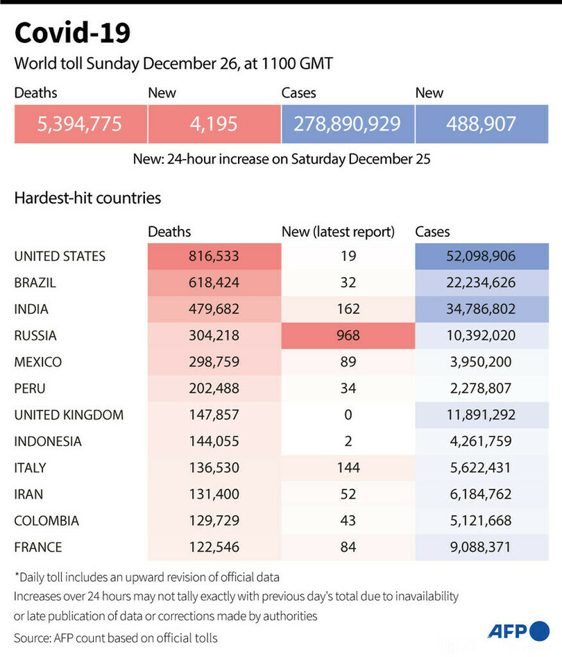 【12月26日 AFP】AFPが各国当局の発表に基づき日本時間26日午後8時にまとめた統計によると、世界の新型コロナウイルスによる死者数は539万4775人に増加した。