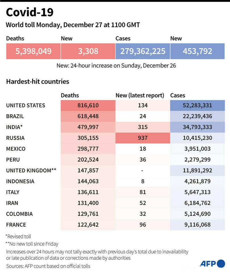 【12月28日 AFP】AFPが各国当局の発表に基づき日本時間27日午後8時にまとめた統計によると、世界の新型コロナウイルスによる死者数は539万8049人に増加した。