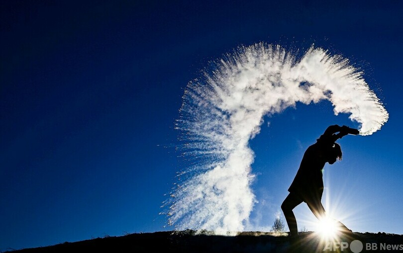 【1月1日 AFP】いてつく寒さの中、魔法瓶に入った熱湯を一気に振りまく女性。微細な水滴が急激に冷やされて雪のように地面に落ち、熱湯が液体・気体・固体の三つの状態を取ることが分かる。よく晴れて気温が下がったドイツ・ベルリンで。(c)AFP