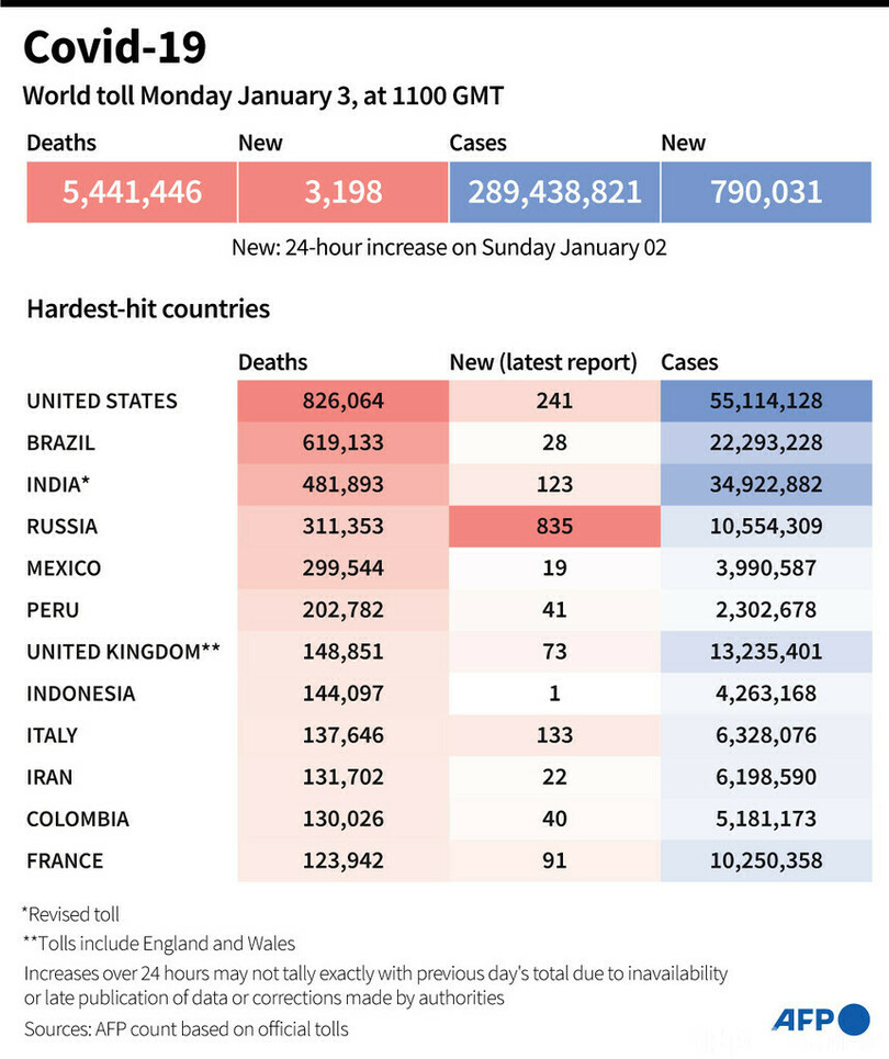 【1月4日 AFP】AFPが各国当局の発表に基づき日本時間1月3日午後8時にまとめた統計によると、世界の新型コロナウイルスによる死者数は544万1446人に増加した。