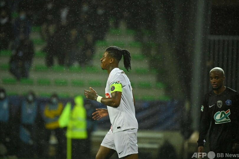 仏西部ブルターニュ(Brittany)地方にあるスタッド・ドゥ・ラ・ラビネ(Stade de la Rabine)の上空にドローンが飛んだことで試合が1分ほど中断した後、PSGはキャプテンマークをつけたプレスネル・キンペンベ(Presnel Kimpembe)が28分にヘディングシュートを決めて先制した。