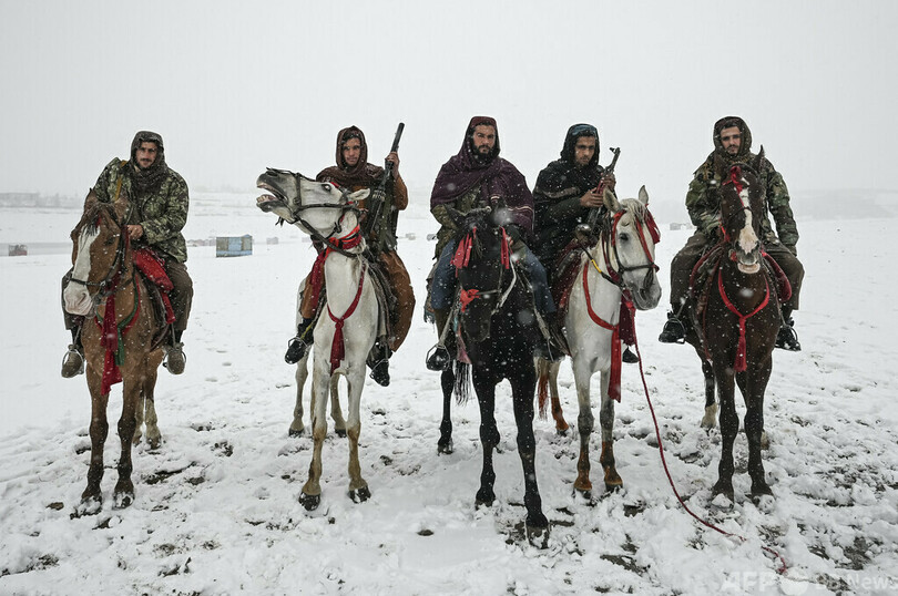 【1月7日 AFP】アフガニスタン・カブールにあるカルガ湖(Qargha Lake)で、雪が舞う中、借りた馬にまたがりカメラに向かってポーズを取るイスラム主義組織タリバン(Taliban)の戦闘員ら。(c)AFP