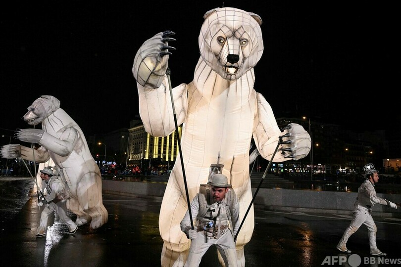 【1月10日 AFP】キリスト教の祝日「公現祭(Epiphany)」の前日に行われた毎年恒例の「東方の三博士」のパレードで、ホッキョクグマの操り人形を動かすパフォーマー。スペイン・マドリードで。