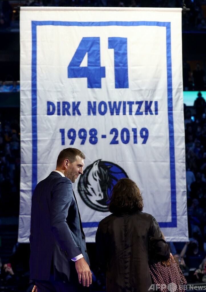試合後にはマーベリックスの象徴であるダーク・ノビツキー(Dirk Nowitzki)氏の背番号41の永久欠番セレモニーが開催されたため、勝利は完璧な演出となった。(c)AFP