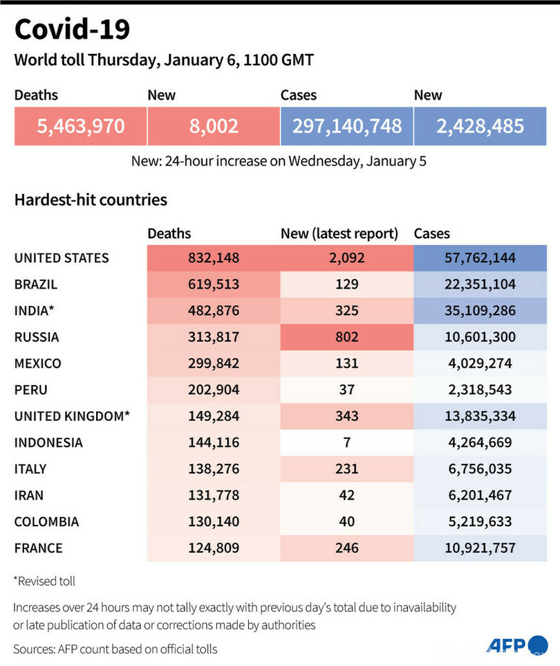 【1月7日 AFP】AFPが各国当局の発表に基づき日本時間6日午後8時にまとめた統計によると、世界の新型コロナウイルスによる死者数は546万3970人に増加した。