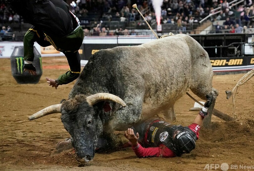 【1月9日 AFP】米ニューヨークのマディソン・スクエア・ガーデン(Madison Square Garden)で7日、ロデオ大会「PBR Unleash The Beast Monster Energy Buckoff」が開催された。(c)AFP