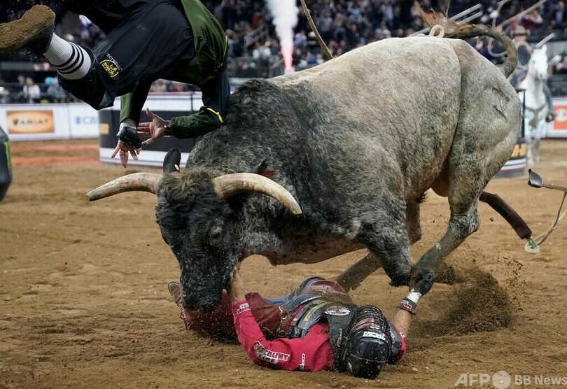 【1月9日 AFP】米ニューヨークのマディソン・スクエア・ガーデン(Madison Square Garden)で7日、ロデオ大会「PBR Unleash The Beast Monster Energy Buckoff」が開催された。(c)AFP