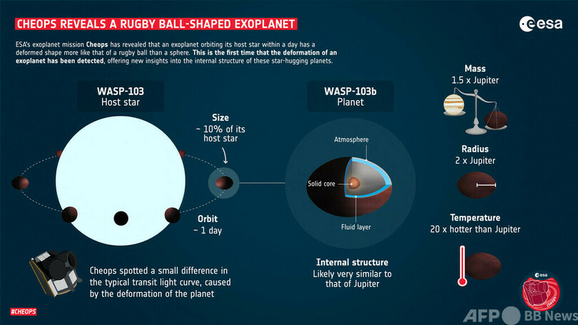 【1月12日 AFP】主星を1日足らずで公転する太陽系外惑星が、球体というよりもラグビーボールに近い形状に変形していることが、欧州宇宙機関(ESA)の宇宙望遠鏡「ケオプス(CHEOPS)」による観測で明らかになった。