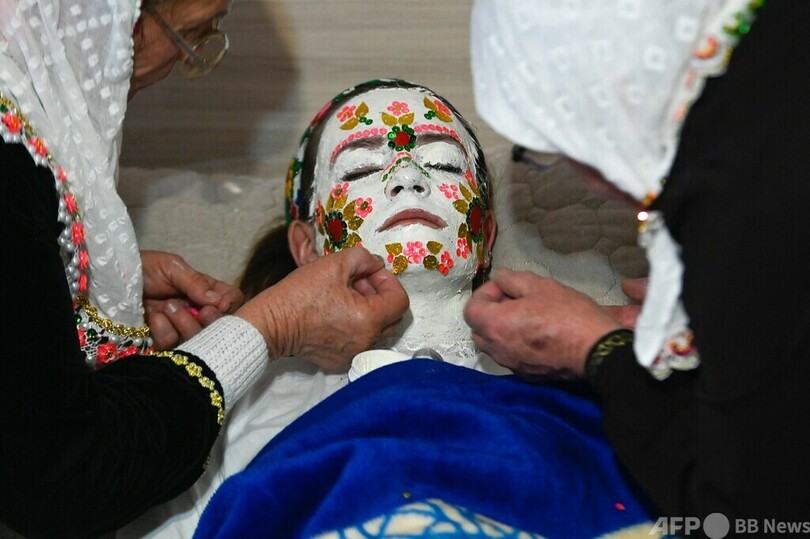 ネフィさんに「特別な化粧」を施したのは、年配の親類女性2人。顔を白く塗り、その上から色とりどりのスパンコールやビーズなどで装飾した。