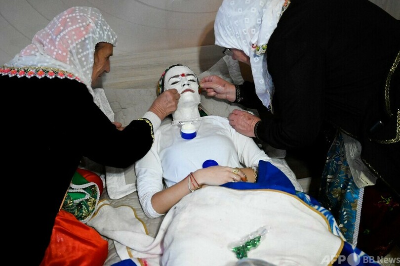 ネフィさんに「特別な化粧」を施したのは、年配の親類女性2人。顔を白く塗り、その上から色とりどりのスパンコールやビーズなどで装飾した。