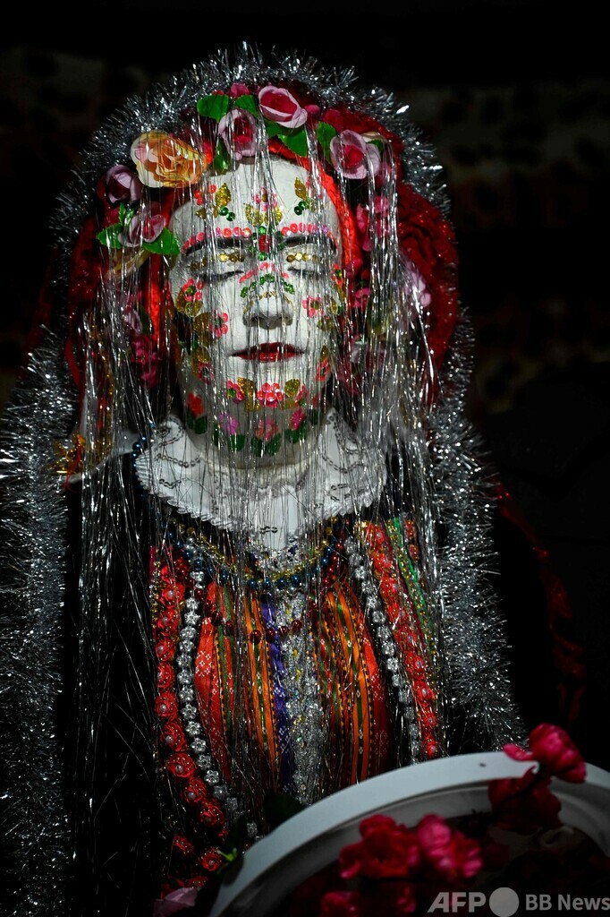 ネフィさんに「特別な化粧」を施したのは、年配の親類女性2人。顔を白く塗り、その上から色とりどりのスパンコールやビーズなどで装飾した。