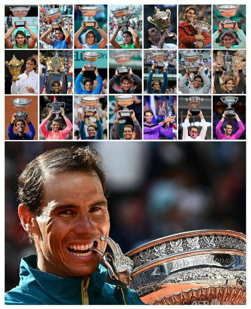 【5月19日 AFP】男子テニスのノバク・ジョコビッチ(Novak Djokovic、セルビア)、ラファエル・ナダル(Rafael Nadal、スペイン)、昨年現役を引退したロジャー・フェデラー(Roger Federer、スイス)の四大大会(グランドスラム)での成績を図解でまとめた。(c)AFP