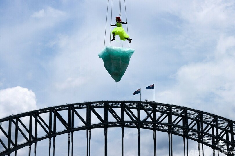 【1月24日 AFP】「2022シドニー・フェスティバル(Sydney Festival)」で、シドニー・ハーバーブリッジ(Sydney Harbour Bridge)の前につるされた作り物の氷山の上で「雪解け」というテーマのパフォーマンスをするアーティストのビクトリア・ハント(Victoria Hunt)さん。オーストラリア・シドニーで。(c)AFP