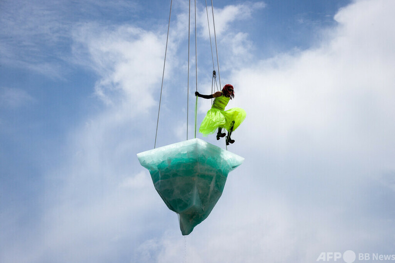 【1月24日 AFP】「2022シドニー・フェスティバル(Sydney Festival)」で、シドニー・ハーバーブリッジ(Sydney Harbour Bridge)の前につるされた作り物の氷山の上で「雪解け」というテーマのパフォーマンスをするアーティストのビクトリア・ハント(Victoria Hunt)さん。オーストラリア・シドニーで。(c)AFP