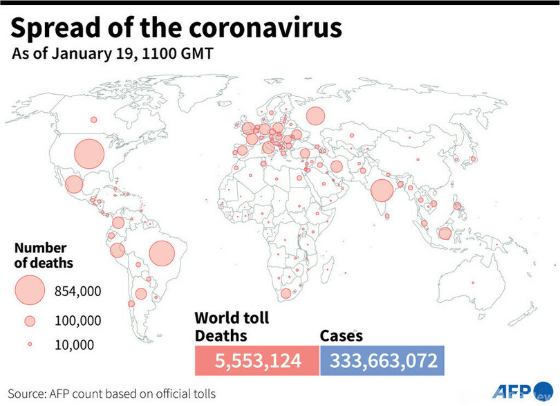【1月20日 AFP】AFPが各国当局の発表に基づき日本時間19日午後8時にまとめた統計によると、世界の新型コロナウイルスによる死者数は555万3124人に増加した。