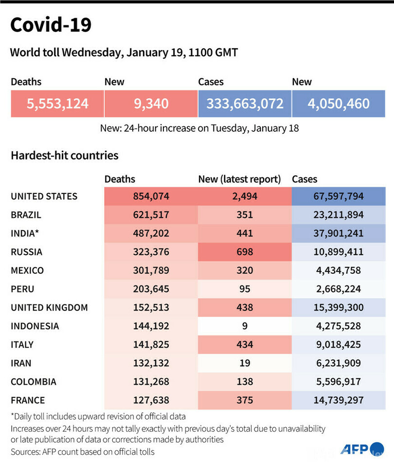 【1月20日 AFP】AFPが各国当局の発表に基づき日本時間19日午後8時にまとめた統計によると、世界の新型コロナウイルスによる死者数は555万3124人に増加した。