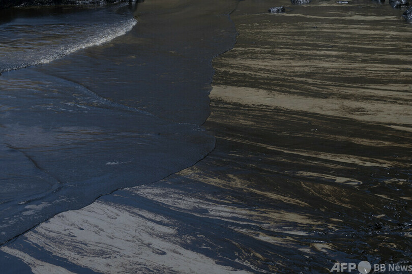 ペルー中部の都市カヤオ(Callao)で17日、海岸に原油が漂着し、作業員が回収作業に当たった。