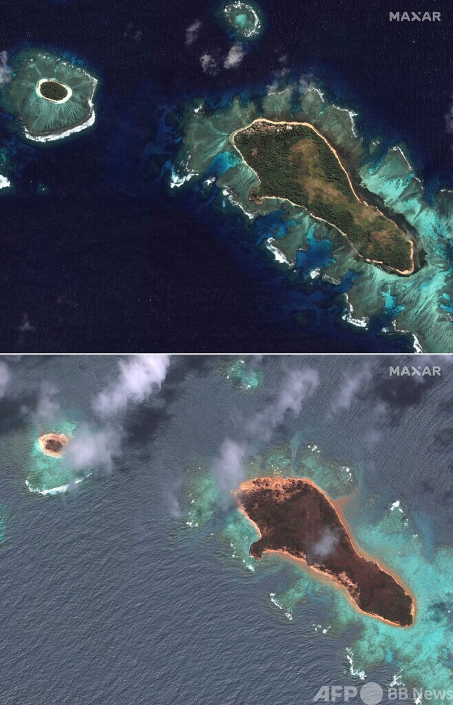 【1月22日 AFP】米宇宙技術会社マクサー・テクノロジーズ(Maxar Technologies)は22日、南太平洋の島国トンガで発生した海底火山の噴火前後の衛星写真を公開した。