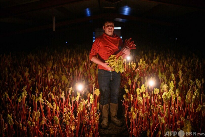 【1月30日 AFP】英イングランド北部で農業を営むロバート・トムリンソン(Robert Tomlinson)さん(41)は、ろうそくの明かりを頼りに、暗い小屋の中でルバーブの茎を一本一本収穫していく。