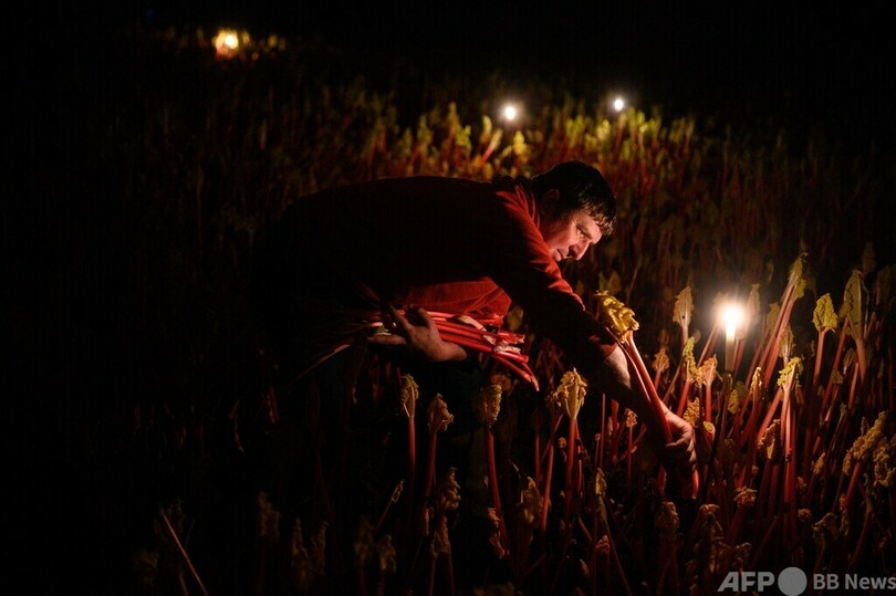 【1月30日 AFP】英イングランド北部で農業を営むロバート・トムリンソン(Robert Tomlinson)さん(41)は、ろうそくの明かりを頼りに、暗い小屋の中でルバーブの茎を一本一本収穫していく。