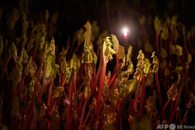 【1月30日 AFP】英イングランド北部で農業を営むロバート・トムリンソン(Robert Tomlinson)さん(41)は、ろうそくの明かりを頼りに、暗い小屋の中でルバーブの茎を一本一本収穫していく。
