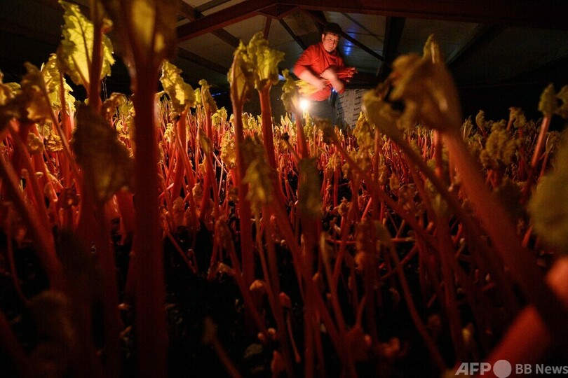 【1月30日 AFP】英イングランド北部で農業を営むロバート・トムリンソン(Robert Tomlinson)さん(41)は、ろうそくの明かりを頼りに、暗い小屋の中でルバーブの茎を一本一本収穫していく。