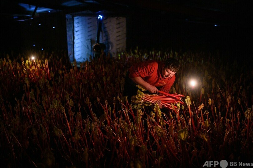 【1月30日 AFP】英イングランド北部で農業を営むロバート・トムリンソン(Robert Tomlinson)さん(41)は、ろうそくの明かりを頼りに、暗い小屋の中でルバーブの茎を一本一本収穫していく。