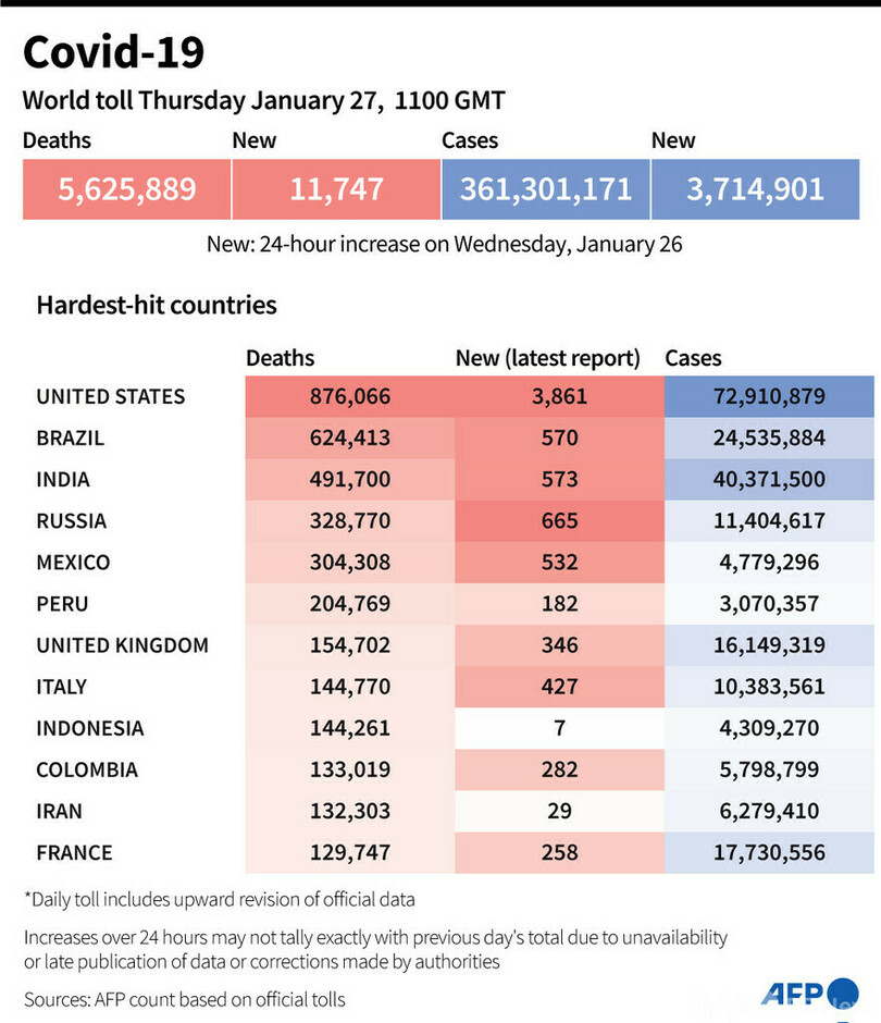 【1月28日 AFP】AFPが各国当局の発表に基づき日本時間27日午後8時にまとめた統計によると、世界の新型コロナウイルスによる死者数は562万5889人に増加した。