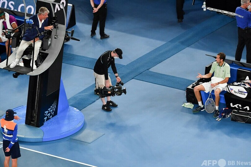 一方のメドベージェフは、4か月前の全米オープンテニス(US Open Tennis Championships 2021)でジョコビッチの21回目のグランドスラム優勝と年間グランドスラムの達成を阻み、今回はナダルに対して同じことを狙っていたが、ジョコビッチに敗れた昨年に続き、全豪オープンでは2年連続で決勝で涙をのむ結果となった。(c)AFP