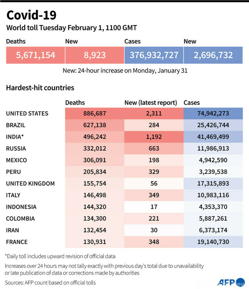 【2月2日 AFP】AFPが各国当局の発表に基づき日本時間1日午後8時にまとめた統計によると、世界の新型コロナウイルスによる死者数は567万1154人に増加した。