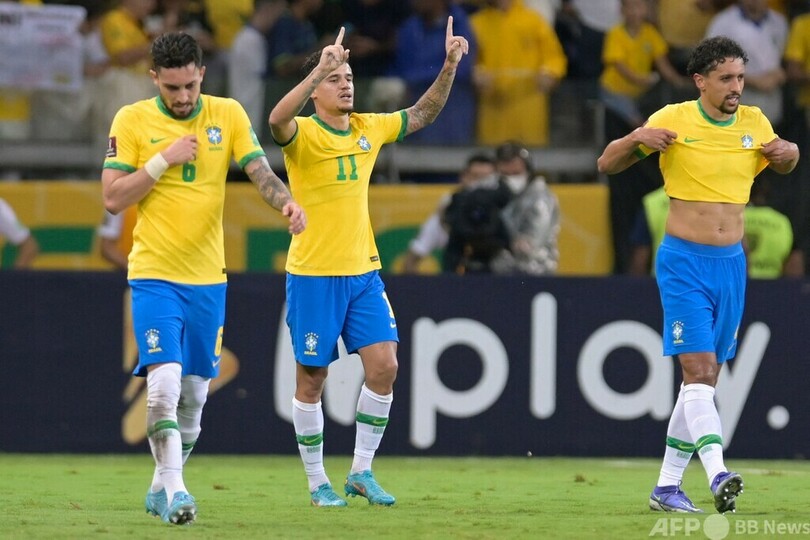 ブラジルは4-0で大勝してパラグアイを敗退に追い込んだ。フィリペ・コウチーニョ・コレイア(Philippe Coutinho Correia)の他に、ラフィーニャ(Raphinha)、アントニー(Antony Matheus dos Santos)、ロドリゴ(Rodrygo)がネットを揺らした。(c)AFP/Barnaby CHESTERMAN