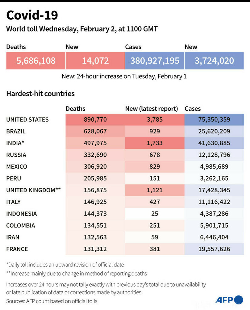 【2月3日 AFP】AFPが各国当局の発表に基づき日本時間2日午後8時にまとめた統計によると、世界の新型コロナウイルスによる死者数は568万6108人に増加した。