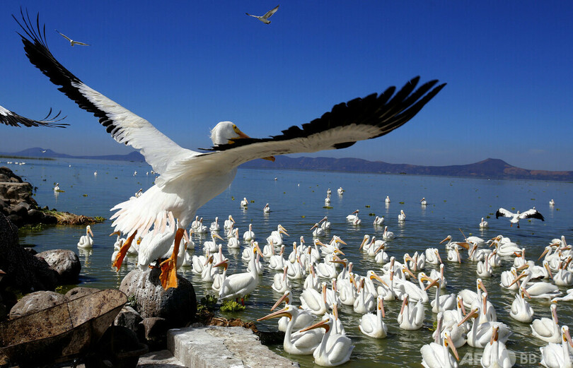 【2月7日 AFP】メキシコ・ミチョアカン(Michoacan)州コフマトランデレグレス(Cojumatlan de Regules)にあるチャパラ(Chapala)湖の岸辺に集まったペリカン。ペリカンはカナダや米国で最大級の鳥で、寒さを避けて数千キロ離れた北米から飛来する。(c)AFP