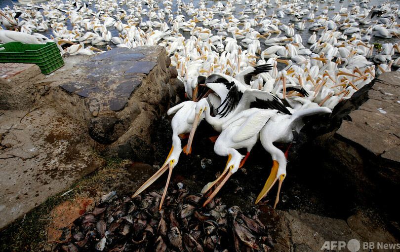 【今日の1枚】大きなくちばしで争奪戦、メキシコ・チャパラ湖のペリカン