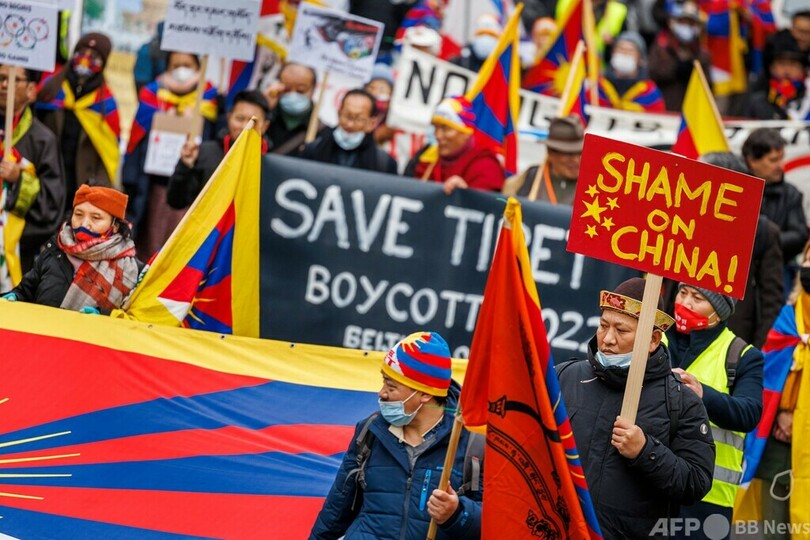 デモ参加者はチベットの旗や、「北京冬季五輪をボイコットせよ」「チベットでの人権侵害をやめろ」「恥の大会」と書かれた横断幕を掲げていた。