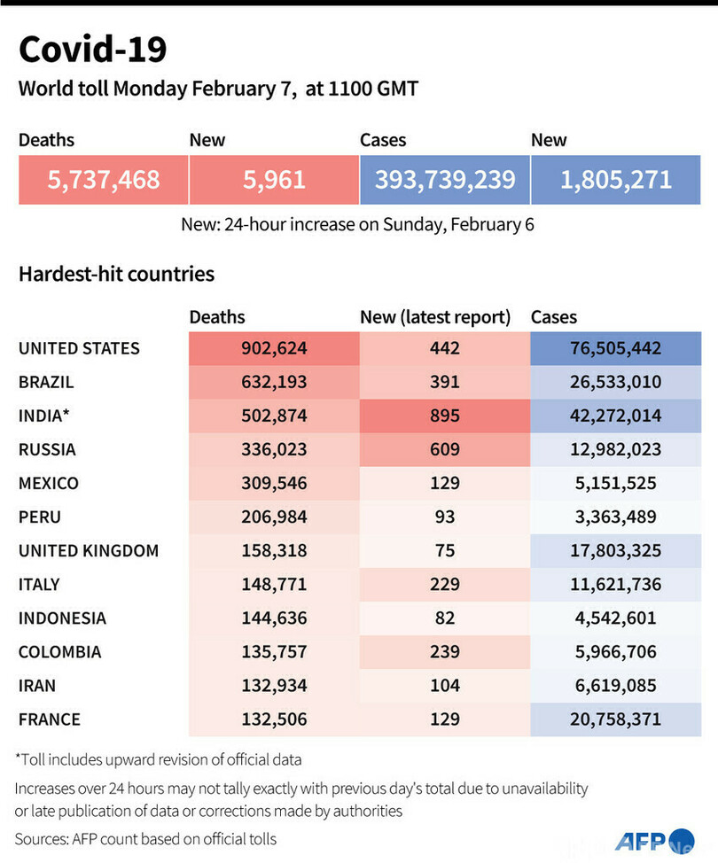 【2月7日 AFP】AFPが各国当局の発表に基づき日本時間7日午後8時にまとめた統計によると、世界の新型コロナウイルスによる死者数は573万7468人に増加した。