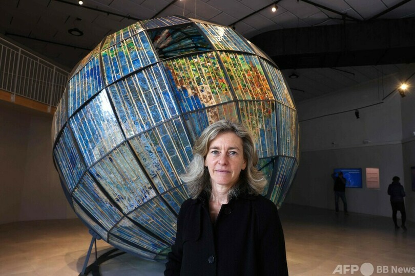 大きな球体の作品は、鉄の骨組みと光を受けて輝く180枚のパネルでできている。外から見るとまるで宝石をちりばめた地球のように見えるが、内側からは、それが海洋に漂うプラスチックごみであることが分かる。地球環境問題に対する関心を高めるのが作品の狙いだ。(c)AFP