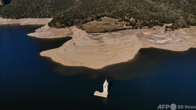 【2月13日 AFP】スペイン・カタルーニャ(Catalonia)自治州ビラノバデサウ(Vilanova de Sau)のサウ(Sau)貯水池から突き出るサンロマ教会(Church of Sant Roma)の塔。近年の水位低下により、水没していた建物の一部が姿を現した。
