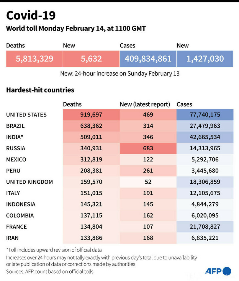 【2月15日 AFP】AFPが各国当局の発表に基づき日本時間14日午後8時にまとめた統計によると、世界の新型コロナウイルスによる死者数は581万3329人に増加した。