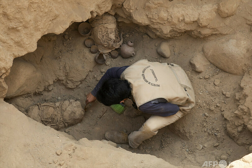 付近では、大人7人の遺骨やラマのような動物の骨、土器なども見つかった。