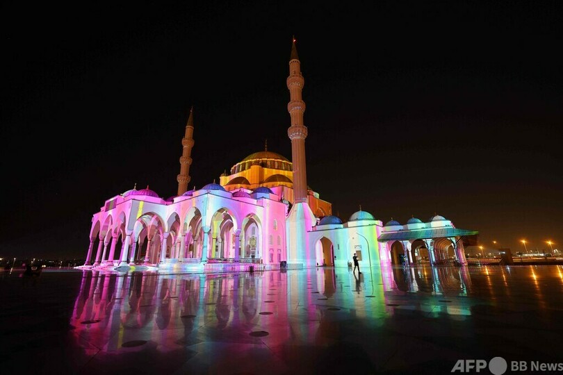 【2月20日 AFP】アラブ首長国連邦(UAE)のシャルジャ(Sharjah)首長国で、恒例の「シャルジャ光の祭典(Sharjah Light Festival)」が開催され、市内にある大講堂やモスクが色鮮やかにライトアップされている。(c)AFP